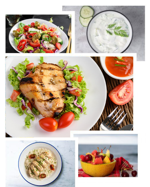 Lunch: Tzatziki & rusk or bread, Greek salad, seafood pasta or chicken & riche, paired with white wine, seasonal fruits and raki.